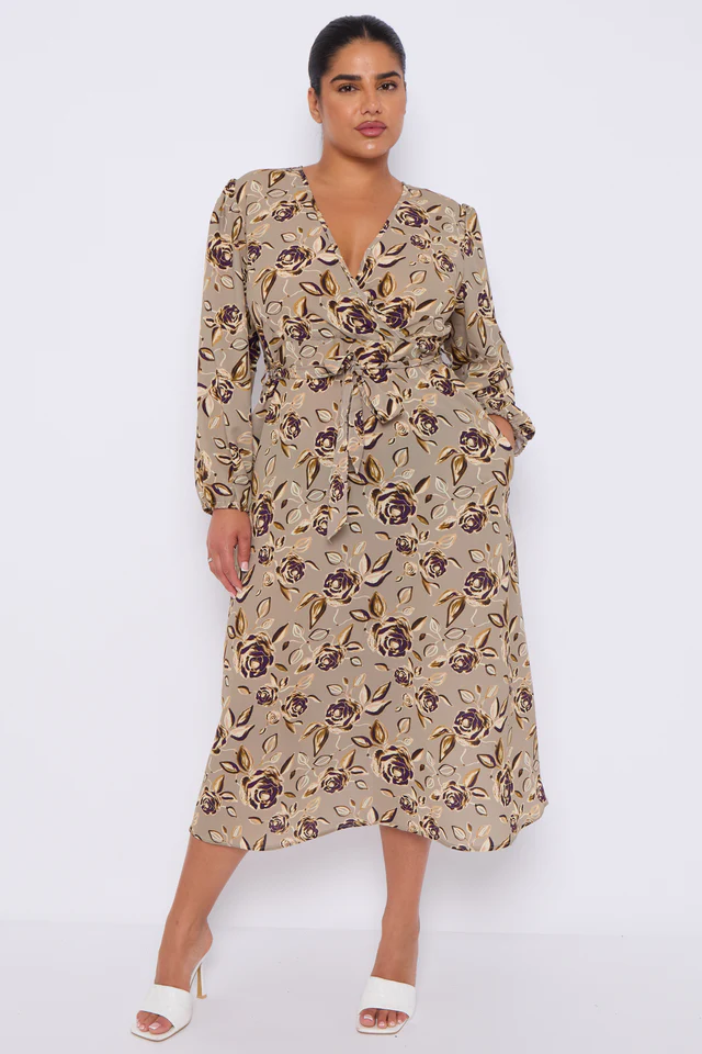 Olivia Taupe Print Crossover Midi Dress