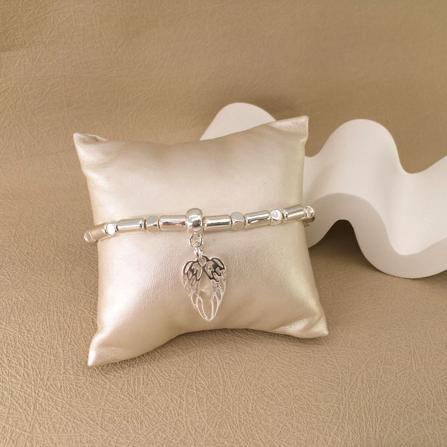 This georgous little braclet with the beautiful angel wing design is a must have. The braclet is elasticated so easy to pop on most wrists.