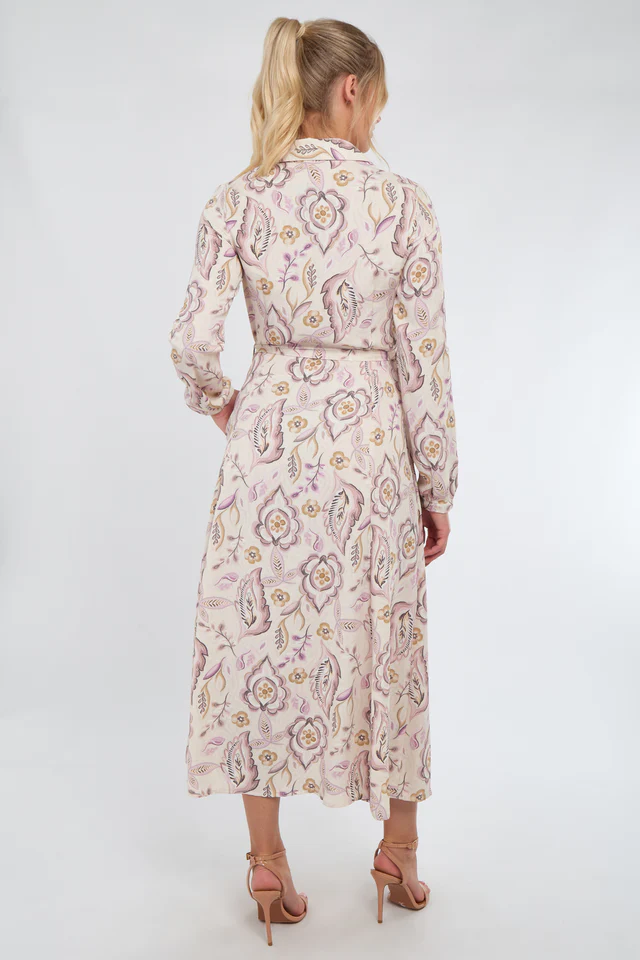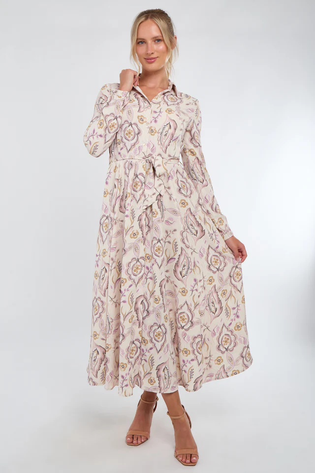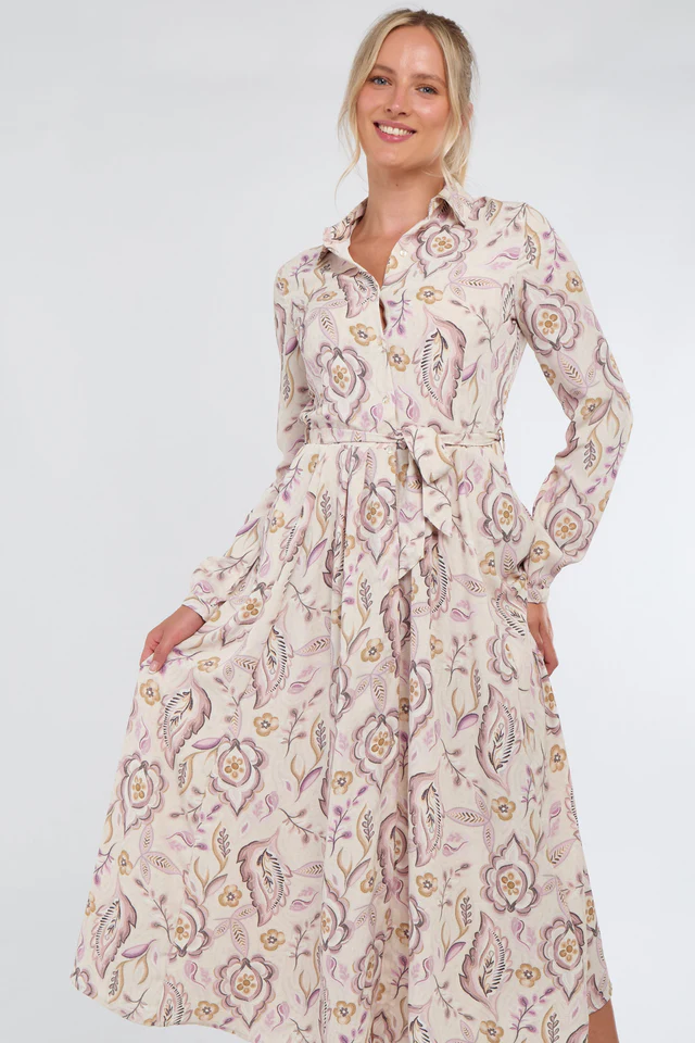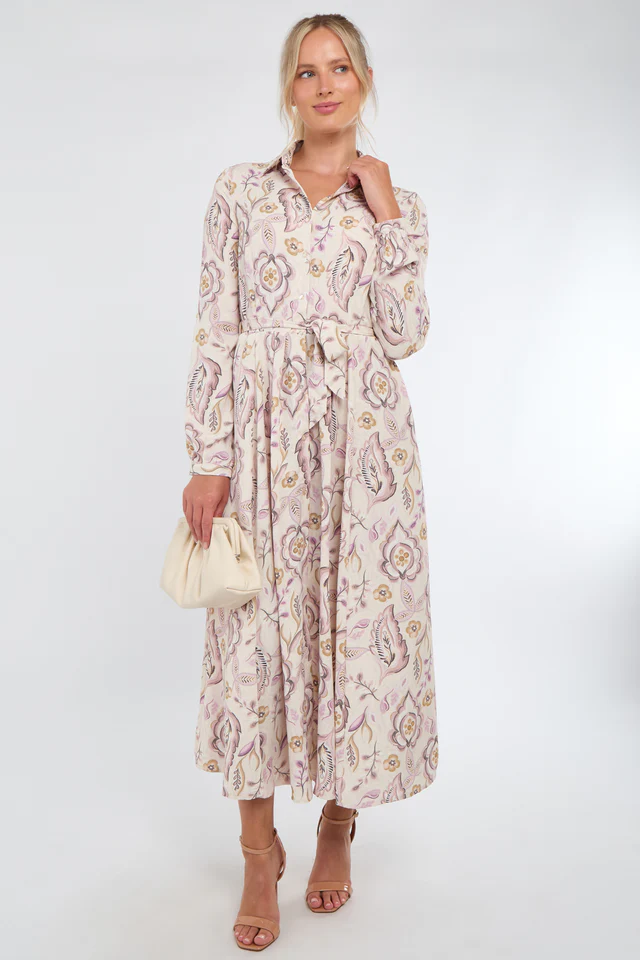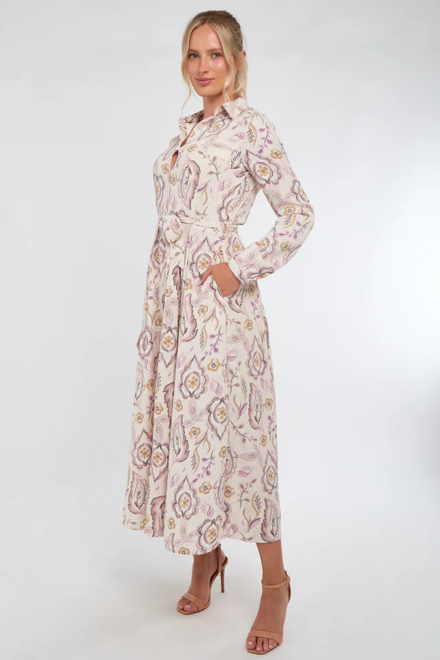 Crafted from a lightweight fabric, it features a classic shirt collar, long sleeves with buttoned cuffs, and a full button-through front for versatile styling. The soft cream backdrop is adorned with delicate blue florals, creating a fresh and feminine look. A self-tie belt cinches the waist for a flattering silhouette, while practical side pockets add functionality. Perfect for garden parties, brunches, or daytime occasions, this maxi dress blends style with ease.