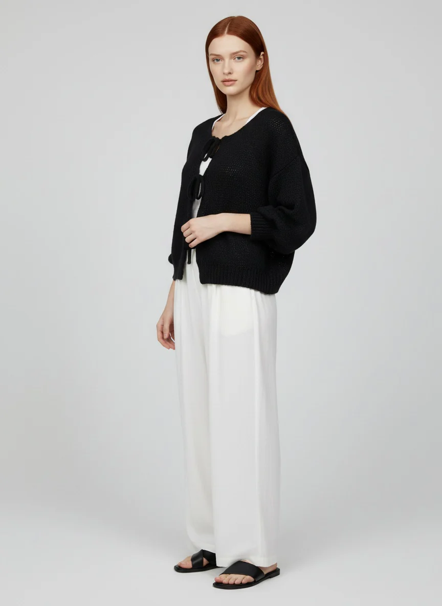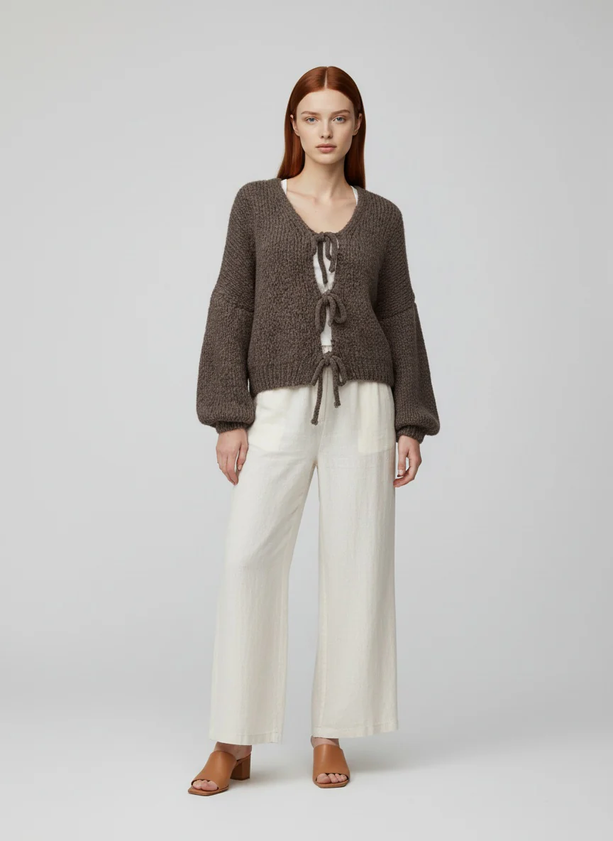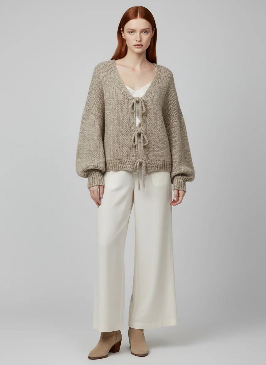 This charming beige cardigan is crafted from a soft, chunky knit blend, offering a delightful texture and warmth perfect for cooler days. Featuring a relaxed, oversized fit and a stylish V-neckline, it’s designed for versatile layering. The unique tie-front closures add a touch of bohemian flair, allowing you to wear it open or subtly cinched.