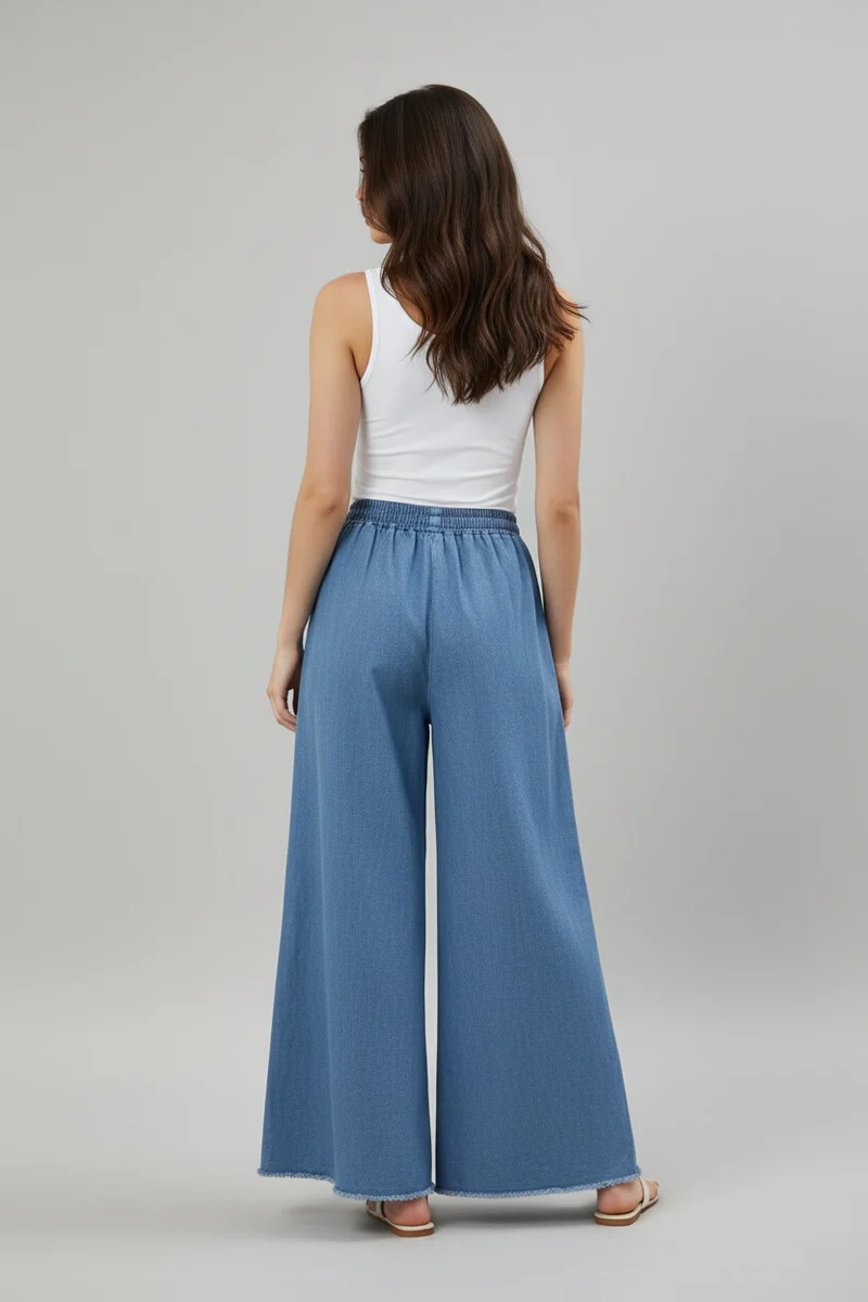 Flowing wide-leg denim trousers offer supreme comfort. Elasticated waist and adjustable drawstring provide a custom fit. Soft, lightweight denim-style fabric ensures a relaxed, stylish silhouette.